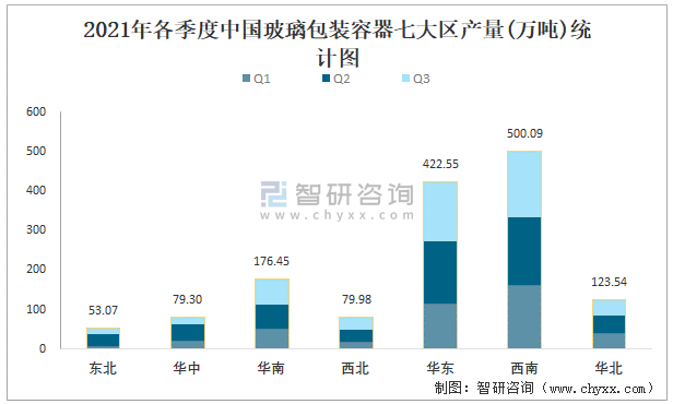 2021年各季度中國玻璃包裝容器七大區(qū)產(chǎn)量統(tǒng)計圖