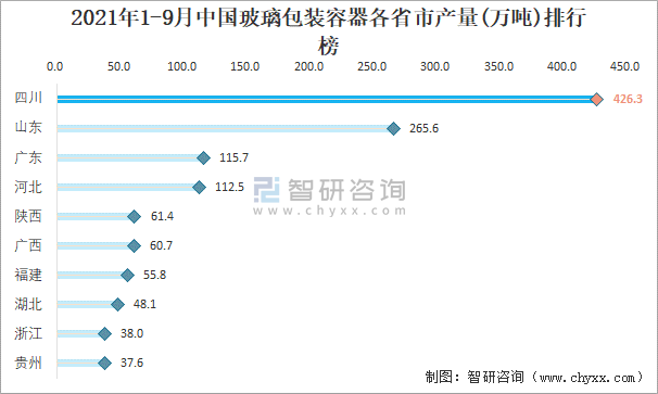 2021年1-9月中國玻璃包裝容器各省市產(chǎn)量排行榜