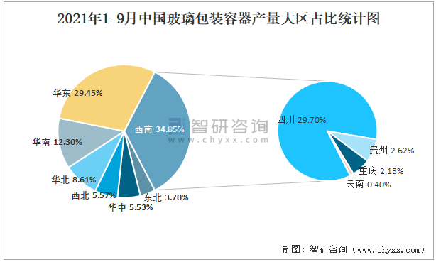 2021年1-9月中國玻璃包裝容器產(chǎn)量為1435萬噸 西南地區(qū)產(chǎn)量最高(占比34.85%)