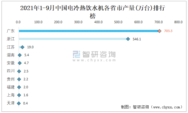 2021年1-9月中國電冷熱飲水機(jī)各省市產(chǎn)量排行榜