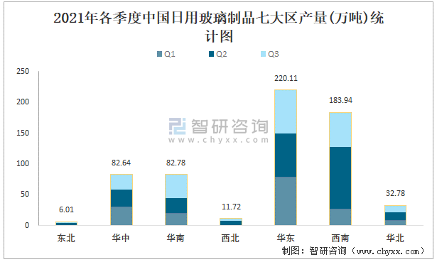 2021年各季度中國日用玻璃制品七大區(qū)產(chǎn)量統(tǒng)計圖
