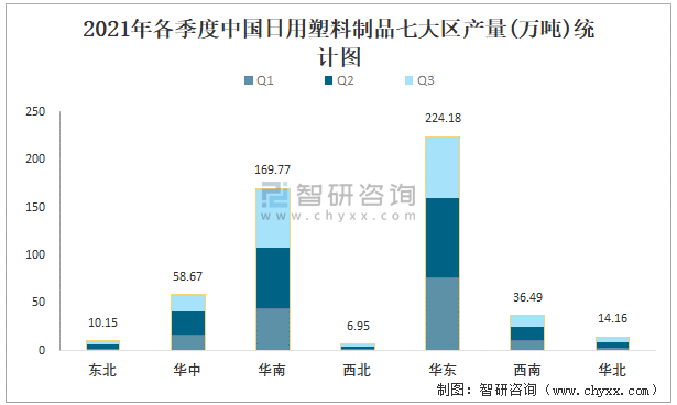 2021年各季度中國日用塑料制品七大區產量統計圖