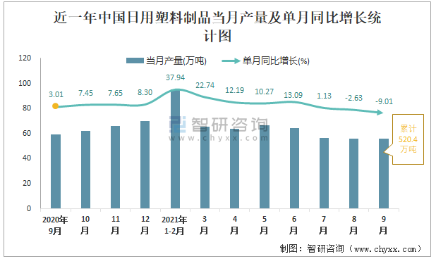 根據國家統計局數據顯示:2021年9月中國日用塑料制品產量為56.1萬噸,同比下降9.01%;2021年1-9月中國日用塑料制品累計產量為520.4萬噸,同比增長14.44%;2015-2020年中國日用塑料制品產量2018年跌至最低,此后逐年遞增。