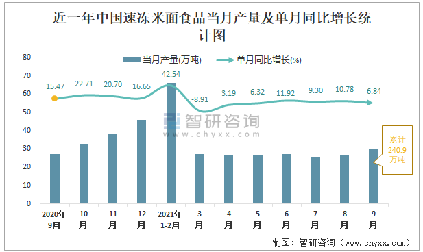 2021年1-9月中國速凍米面食品產量為240.9萬噸 同比增長10.56%