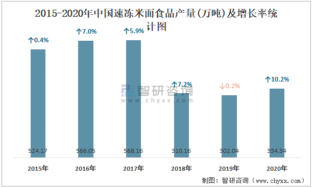 2015-2020年中國速凍米面食品產量及增長率統計圖