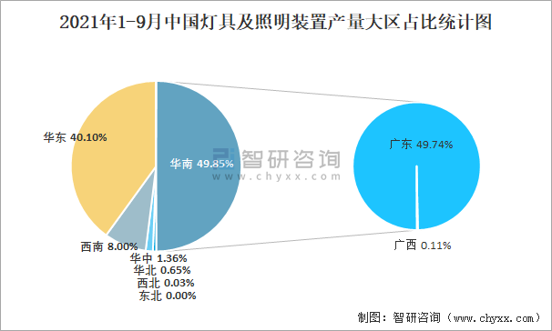 2021年1-9月中國燈具及照明裝置產量為39.5億套(臺、個) 華南地區產量最高(占比49.85%)