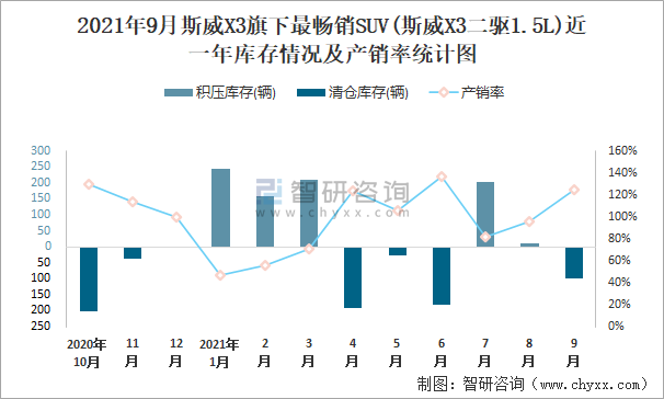 2021年9月斯威X3旗下最暢銷SUV(斯威X3二驅(qū)1.5L)近一年庫存情況及產(chǎn)銷率統(tǒng)計圖