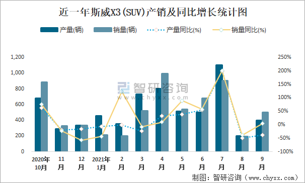 近一年斯威X3(SUV)產(chǎn)銷及同比增長統(tǒng)計圖