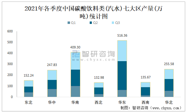 2021年各季度中國碳酸飲料類(汽水)七大區(qū)產量統計圖