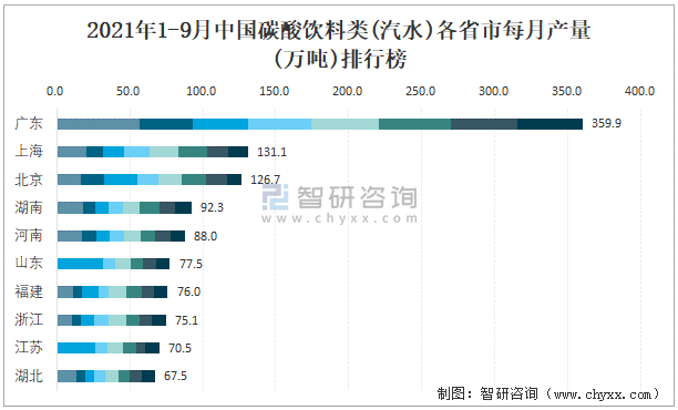 2021年1-9月中國碳酸飲料類(汽水)各省市每月產量排行榜