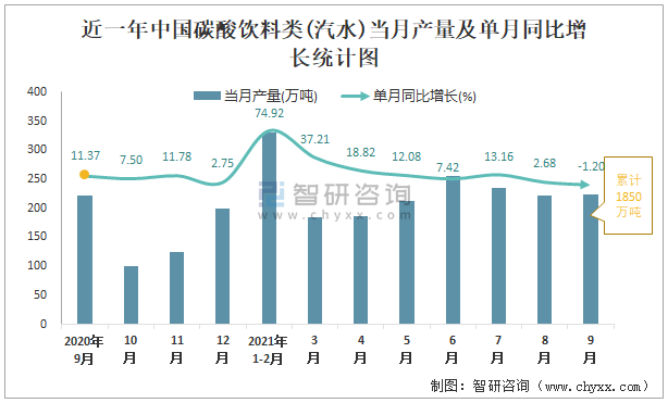 根據國家統計局數據顯示:2021年9月中國碳酸飲料類(汽水)產量為224萬噸,同比下降1.2%;2021年1-9月中國碳酸飲料類(汽水)累計產量為1850萬噸,同比增長19.32%;2015-2020年中國碳酸飲料類(汽水)產量2017年跌至最低,此后逐年遞增。