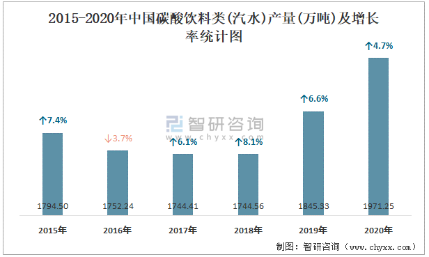 2015-2020年中國碳酸飲料類(汽水)產量及增長率統計圖