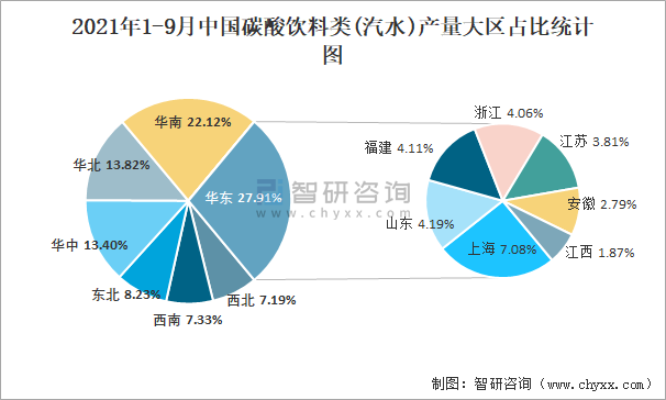 2021年1-9月中國碳酸飲料類(汽水)產量大區(qū)占比統計圖