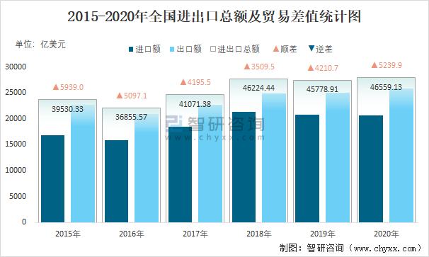 2015-2020年全國進出口總額及貿易差值統計圖