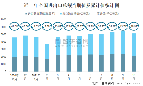 2021年1-10月全國進出口總額為48.92千億美元,累計同比增長31.9%