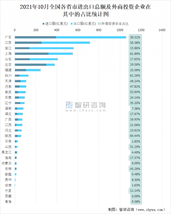 2021年10月全國各省市進出口總額及外商投資企業在其中的占比統計圖