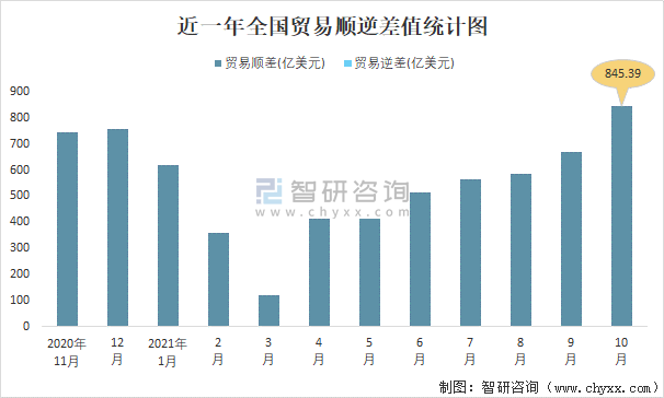 近一年全國貿易順逆差值統計圖