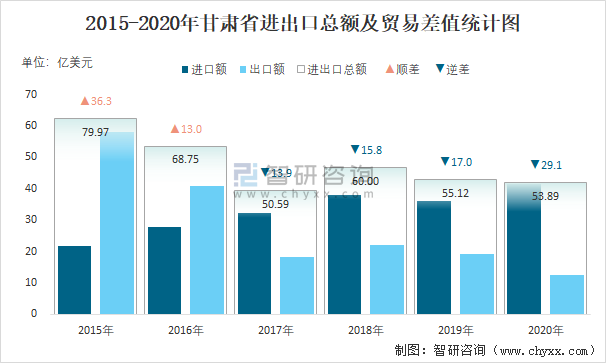 2015-2020年甘肅省進出口總額及貿易差值統計圖
