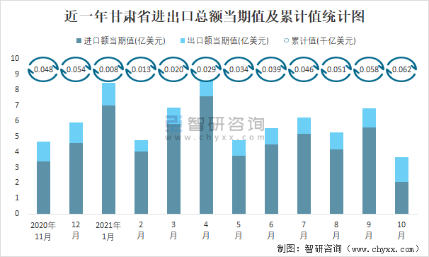 近一年甘肅省進出口總額當期值及累計值統計圖