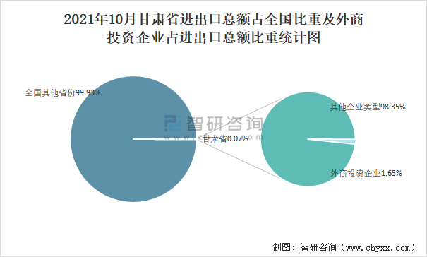2021年10月甘肅省進出口總額占全國比重及外商投資企業占進出口總額比重統計圖