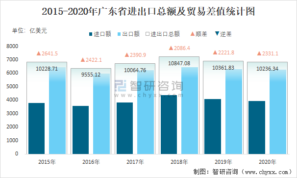 2015-2020年廣東省進(jìn)出口總額及貿(mào)易差值統(tǒng)計(jì)圖