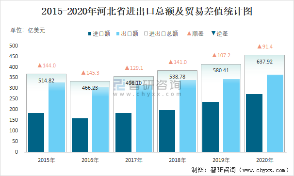 2015-2020年河北省進(jìn)出口總額及貿(mào)易差值統(tǒng)計(jì)圖