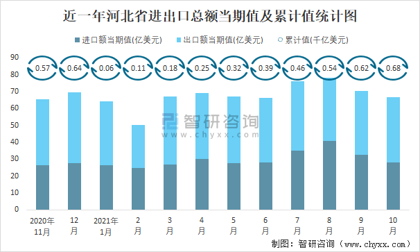 近一年河北省進(jìn)出口總額當(dāng)期值及累計(jì)值統(tǒng)計(jì)圖