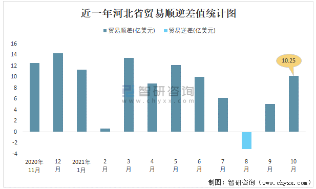 近一年河北省貿(mào)易順逆差值統(tǒng)計(jì)圖