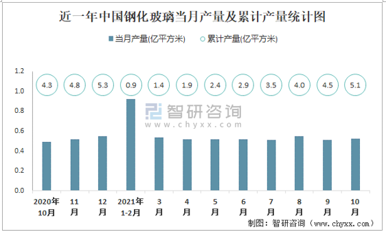 根據國家統計局數據顯示:2021年10月中國鋼化玻璃產量為0.5億平方米,同比增長1.1%;2021年1-10月中國鋼化玻璃累計產量為5.1億平方米,累計增長16.3%;2015-2020年中國鋼化玻璃產量2018年跌至最低,此后逐年遞增。