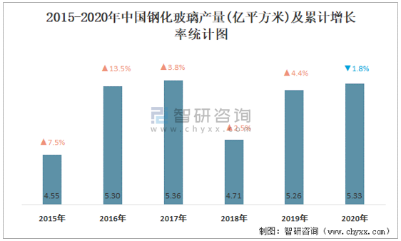 2015-2020年中國鋼化玻璃產量及累計增長率統計圖