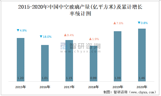 2015-2020年中國中空玻璃產量及累計增長率統計圖