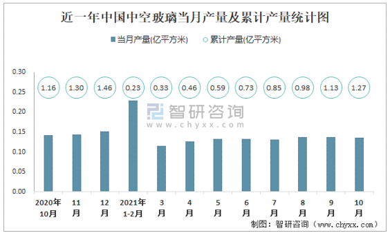 近一年中國中空玻璃當月產量及累計產量統計圖