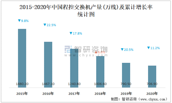 2015-2020年中國程控交換機(jī)產(chǎn)量及累計(jì)增長率統(tǒng)計(jì)圖