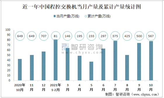 根據(jù)國家統(tǒng)計(jì)局?jǐn)?shù)據(jù)顯示:2021年10月中國程控交換機(jī)產(chǎn)量為77.8萬線,同比增長112.6%;2021年1-10月中國程控交換機(jī)累計(jì)產(chǎn)量為566.7萬線,累計(jì)下降6.6%;2015-2020年中國程控交換機(jī)產(chǎn)量逐年遞減。