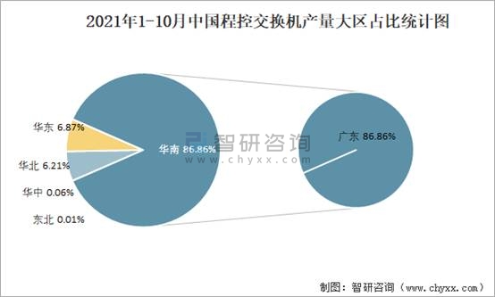 2021年1-10月中國程控交換機(jī)產(chǎn)量大區(qū)占比統(tǒng)計(jì)圖