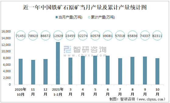 根據(jù)國(guó)家統(tǒng)計(jì)局?jǐn)?shù)據(jù)顯示:2021年10月中國(guó)鐵礦石原礦產(chǎn)量為8013萬(wàn)噸,同比下降2.8%;2021年1-10月中國(guó)鐵礦石原礦累計(jì)產(chǎn)量為82311.1萬(wàn)噸,累計(jì)增長(zhǎng)11.5%;2015-2020年中國(guó)鐵礦石原礦產(chǎn)量2018年跌至最低,此后逐年遞增。