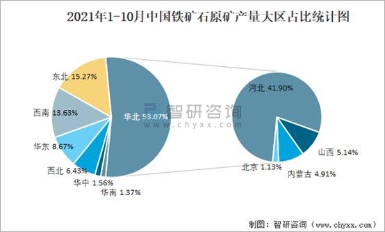 2021年1-10月中國(guó)鐵礦石原礦產(chǎn)量大區(qū)占比統(tǒng)計(jì)圖