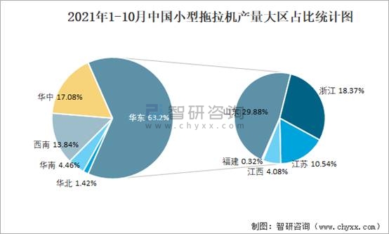 2021年1-10月中國小型拖拉機產量大區占比統計圖
