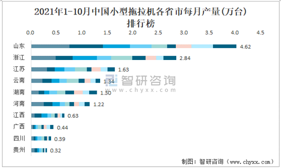2021年1-10月中國小型拖拉機各省市每月產量排行榜