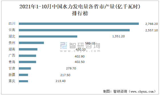 2021年1-10月中國水力發(fā)電量各省市產(chǎn)量排行榜