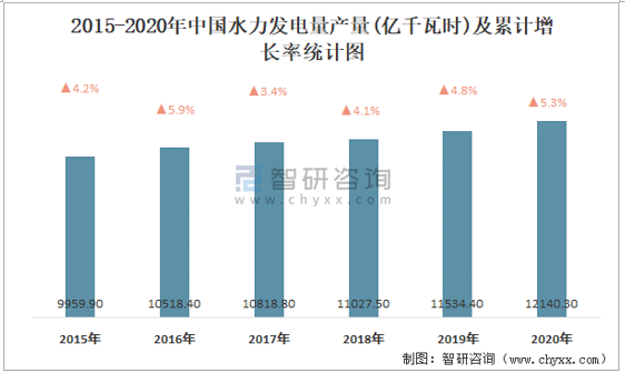 2015-2020年中國水力發(fā)電量產(chǎn)量及累計(jì)增長率統(tǒng)計(jì)圖