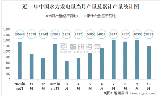 近一年中國水力發(fā)電量當(dāng)月產(chǎn)量及累計(jì)產(chǎn)量統(tǒng)計(jì)圖