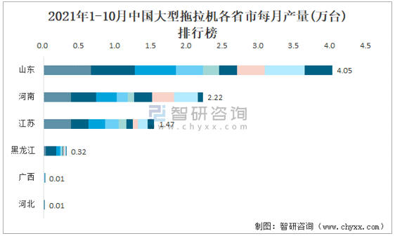 2021年1-10月中國大型拖拉機各省市每月產量排行榜