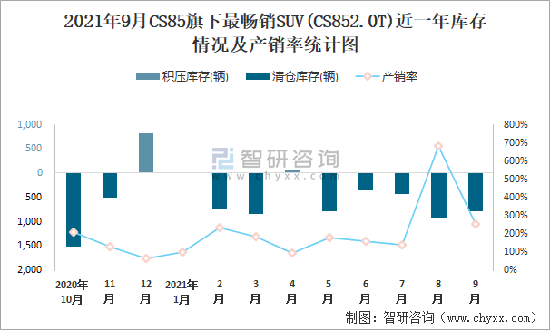2021年9月CS85旗下最暢銷SUV(CS852.0T)近一年庫存情況及產(chǎn)銷率統(tǒng)計(jì)圖