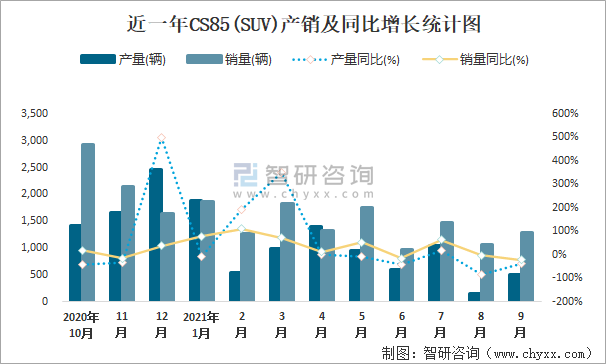 近一年CS85(SUV)產(chǎn)銷及同比增長統(tǒng)計(jì)圖