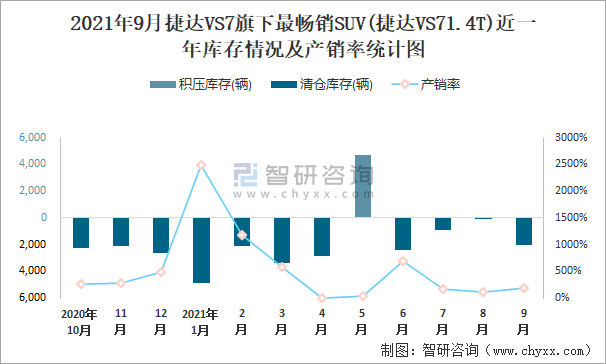 2021年9月捷達VS7旗下最暢銷SUV(捷達VS71.4T)近一年庫存情況及產銷率統計圖