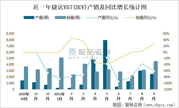 近一年捷達VS7(SUV)產銷及同比增長統計圖