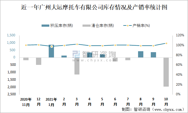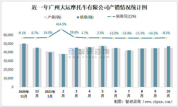 近一年廣州大運摩托車有限公司產銷情況統計圖