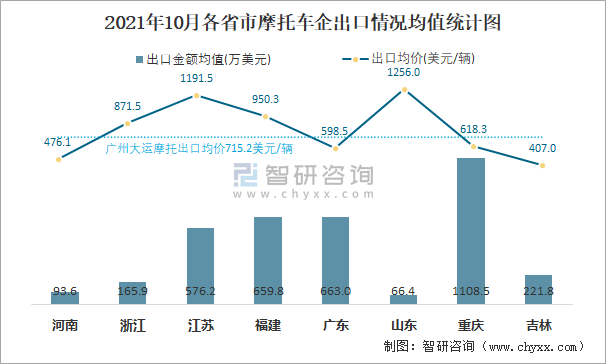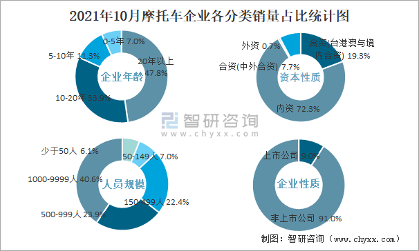 根據中國汽車工業(摩托車)產銷快訊與企查查數據統計可知:2021年10月92家車企摩托車銷量為1657429輛,出口總金額約為50967.89萬美元(其中有兩家子公司,其數據已包含在母公司中,不參加行業匯總);2021年10月92家車企擁有20年以上企業年齡的銷量最高,從企業資本性質來看,銷量占比最大的為內資企業(部分上市公司股份不明確的企業未統計在內),從企業人員規模來看,擁有1000-9999人員規模的車企銷量占比最大,非上市公司銷量占比最高。92家車企主要分布在10個省(市),其中廣東車企最多(26個),部分省市車企不出口,從出口金額均值來看,重慶車企(18家企業)出口金額均值最高,廣州大運摩托車有限公司約為715.2美元/輛,高于廣東出口均價。