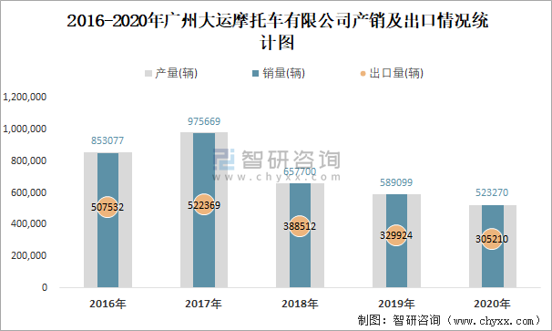 2016-2020年廣州大運摩托車有限公司產銷及出口情況統計圖